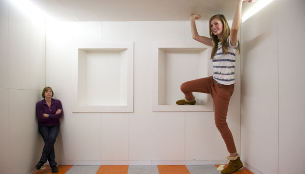 De Kamer van Ames, in 1934 uitgevonden door opticus Adelbert Ames, is gezichtsbedrog ten top. Maar hoe zit de vork nou eigenlijk in de steel? Hoe kan het meisje zo reusachtig lijken en de vrouw zo klein, ondanks het feit dat ze zich in dezelfde ruimte begeven, misschien twee, drie meter uit elkaar? Hoe kunnen je ogen je zo bedriegen?