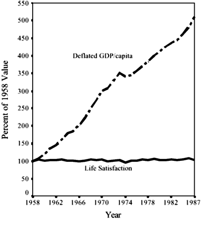 Literatuur over geluk en welbevinden wijst uit dat, in tegenstelling tot wat we vaak denken, geld niet gelukkig maakt. Diener en Biswas-Diener (2002) vonden weliswaar dat je misschien dan wel beter af bent als je niet arm bent en tevens niet in een arm land woont, maar ook dat geld boven een bepaalde minimale inkomensgrens (ongeveer €10.000) niet gelukkiger maakt. Een exemplarisch voorbeeld van hun bevindingen is dat in landen waar veel economische groei is (een stijging van het bruto nationaal inkomen), zoals in Nederland, Japan en Amerika, de tevredenheid met het leven vrijwel hetzelfde is gebleven (zie figuur 1).
